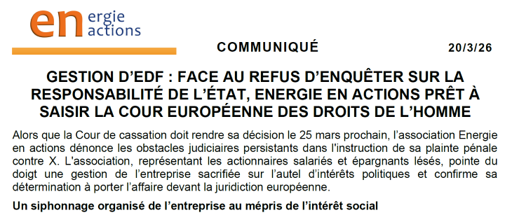 Alors que la Cour de cassation doit rendre sa décision le 25 mars prochain, l’association Energie en actions dénonce les obstacles judiciaires persistants dans l'instruction de sa plainte pénale contre X déposée le 31 août 2022. L'association, représentant les actionnaires salariés et épargnants lésés, pointe du doigt une gestion de l’entreprise sacrifiée sur l’autel d’intérêts politiques et confirme sa détermination à porter l’affaire devant la juridiction européenne.